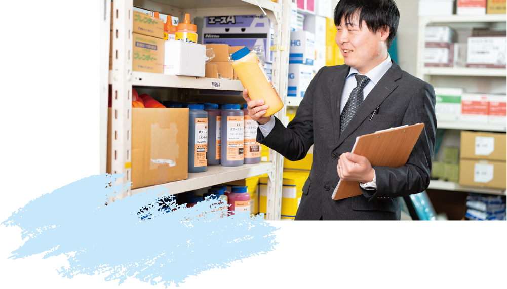 職業案内で社長とお話をさせていただき、塗料販売の魅力をお伺いしました。初めは塗料の種類の多さに戸惑いましたが、親切なお客様に中身を見せていただいたり、使い方を教えていただいたりしている間に、塗料に対する知識が増えてきました。今では経験を活かして色々な現場の提案をしています。