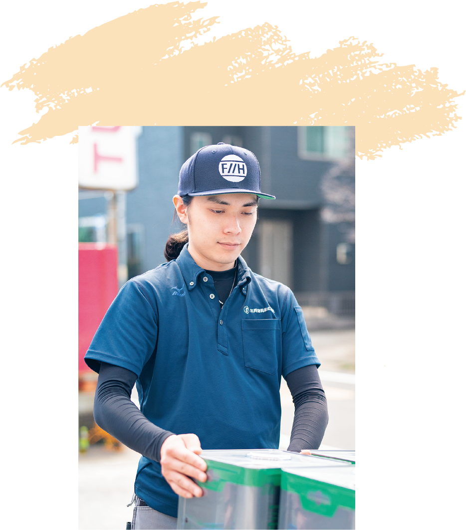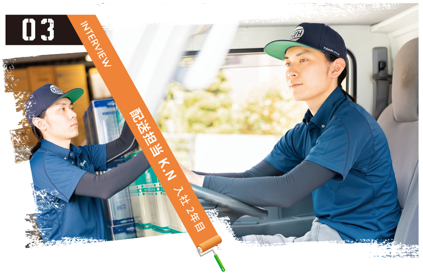 もともとクルマの運転が好きで、配送の仕事を探している時に知人から弊社で募集があると伺い、仕事内容を詳しく聞きました。業務内容を聞いているうちに三興塗料に興味を持ち、面接に挑みました。面接では緊張することなく自分の素を出せて話せたのでこの会社なら自分らしく働けるのではないかと思い入社に至りました。