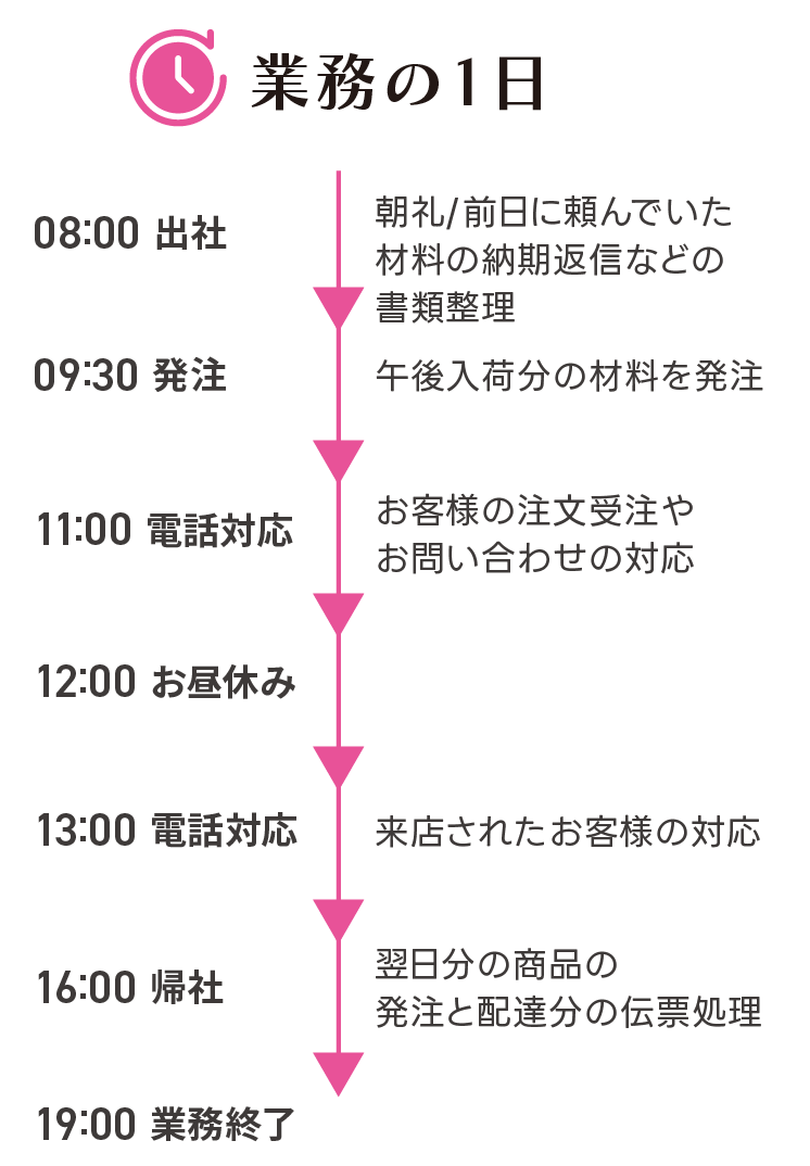 業務の仕事ではノルマなど数値として明確にできるものがありません。そのため自分自身で目標を持って向き合うことが大切だと考えております。お客様が必要な物を言われたまま手配するのではなく、他に必要な物がないか、より良い商品はないか等、少しでも電話して良かったと感じていただけるような心構えも大切です。他の人の電話内容もなるべく聞くようにしています。何を聞かれているのか、どのように答えているのかなど、これからの自分の成長に繋がるからです。