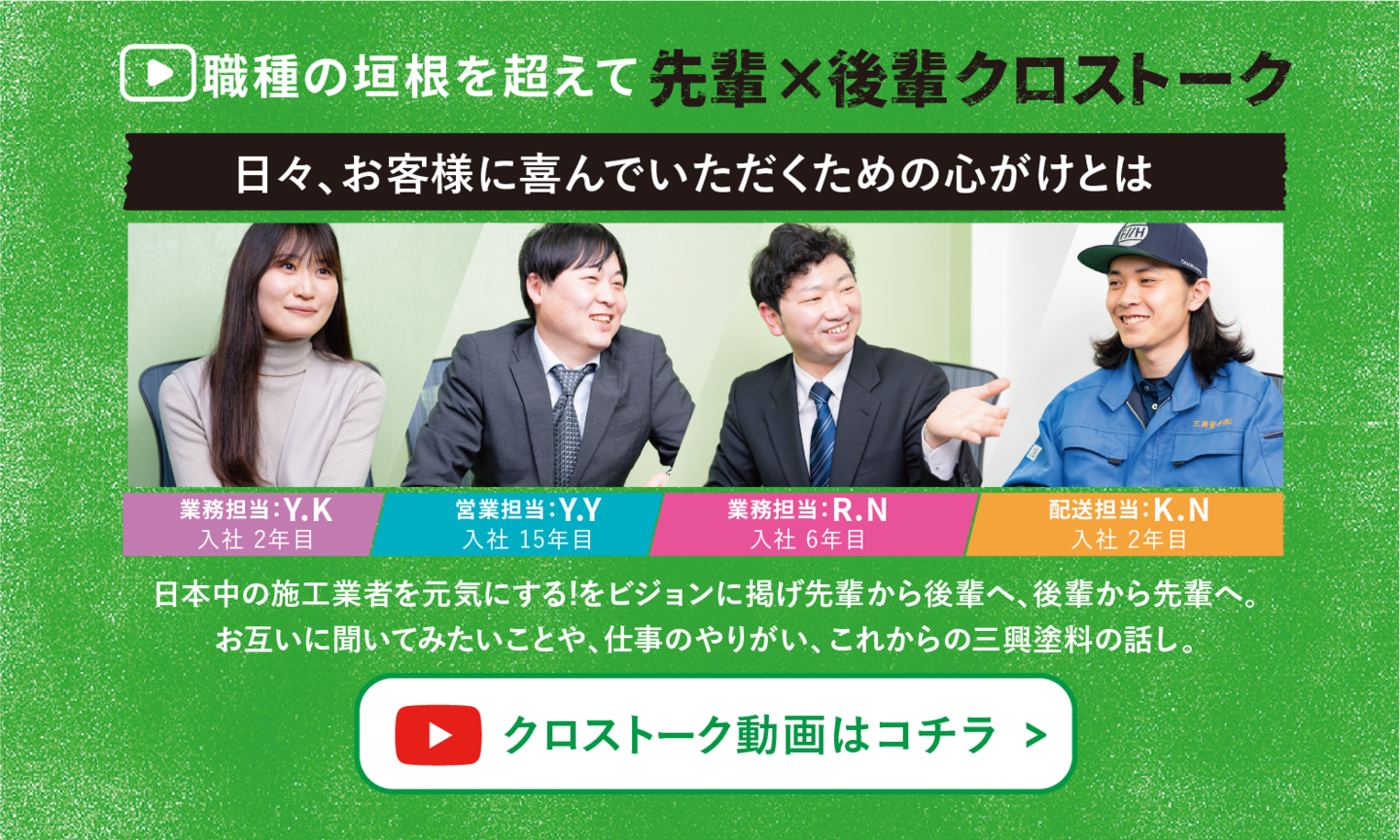私もこの業界に入ったばかりの頃は右も左も分からず大変でした。今では、三興塗料に入社して良かったと心から思っています。同じ商品を施工業者様に卸す同業者の中で、三興塗料は一番お客様に喜んでいただける良い会社だと思っています。塗料業界に少しでも興味があれば是非、三興塗料に来てみてください。