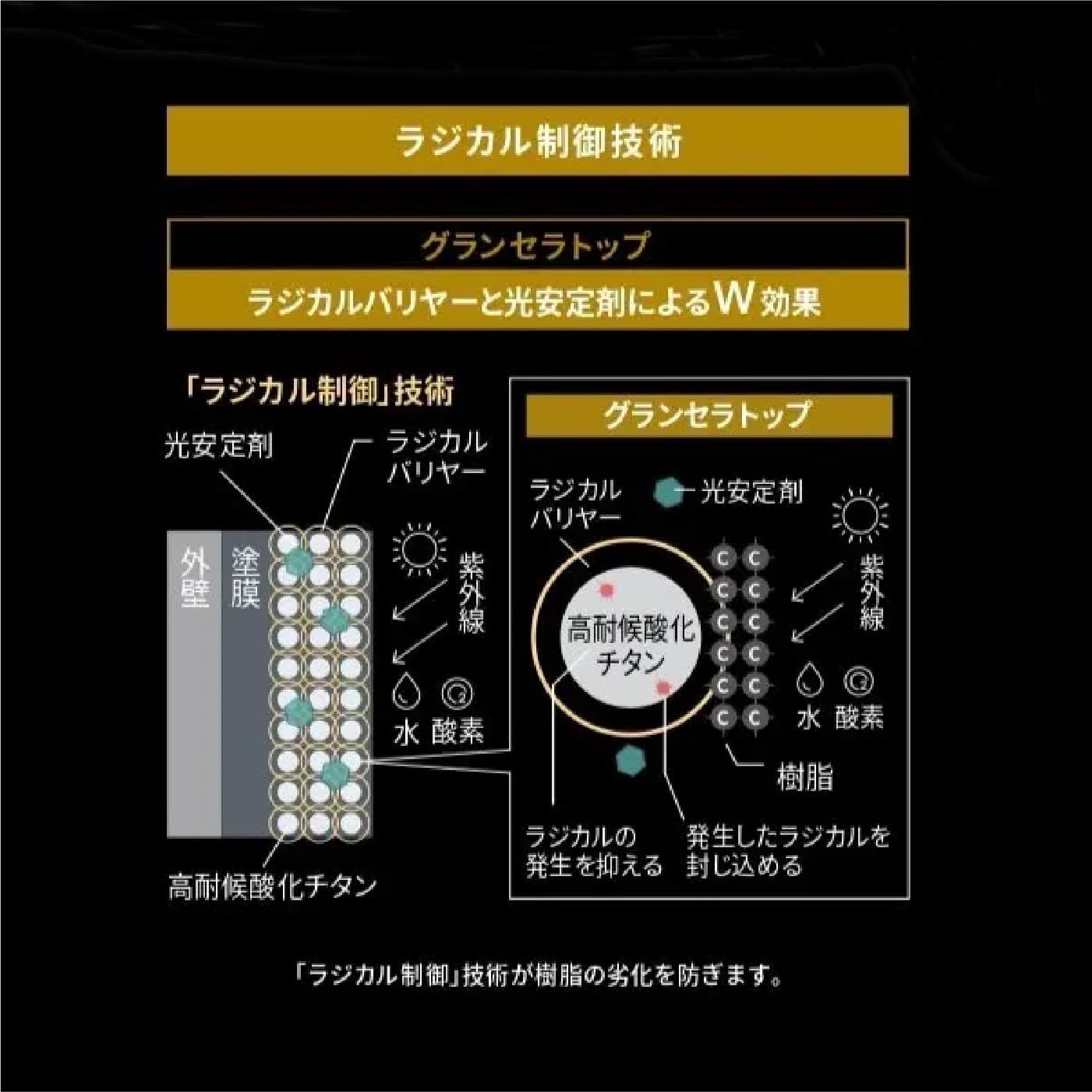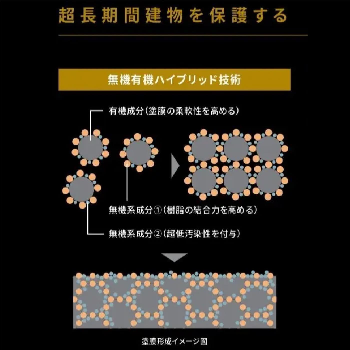 - 塗膜の柔軟性を高め割れにくくする【有機成分】と、塗膜の強さと超低汚染性を付与する【無機成分】を配合したハイブリッド無機塗料