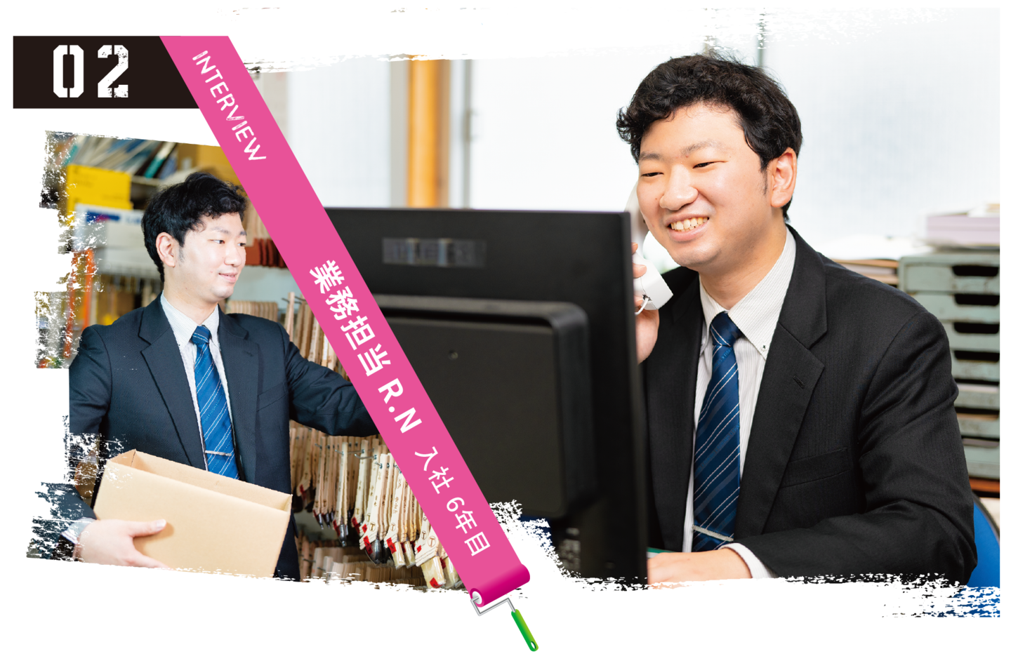 職業案内で社長とお話をさせていただき、塗料販売の魅力をお伺いしました。初めは塗料の種類の多さに戸惑いましたが、親切なお客様に中身を見せていただいたり、使い方を教えていただいたりしている間に、塗料に対する知識が増えてきました。今では経験を活かして色々な現場の提案をしています。